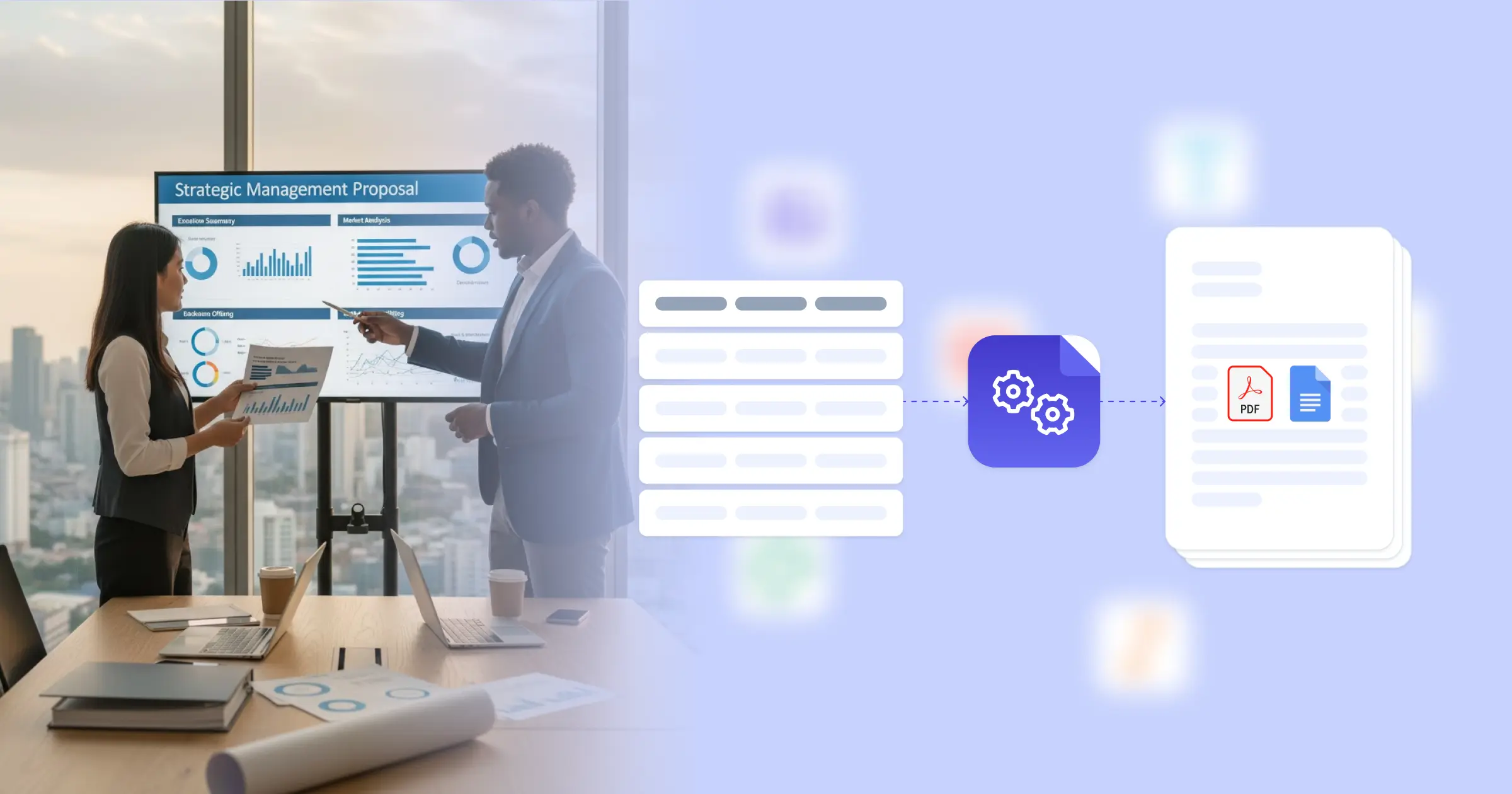 Management proposals communicate how your consulting or professional services team will solve client challenges through strategic guidance, process improvements, or organizational change. According to Forbes research on business growth, successful consulting engagements begin with clear proposal documentation that aligns stakeholder expectations. Business development teams typically pull client background from CRM systems, assemble service offerings from internal knowledge bases, and format pricing from rate cards. The mechanism is straightforward: connect Google Docs templates with your data sources, whether that's Airtable tracking opportunities, your CRM holding client information, or Glide apps managing service catalogs, and proposals generate with client details, relevant methodologies, and accurate pricing already in place. Your team focuses on customizing the strategic approach rather than formatting documents.